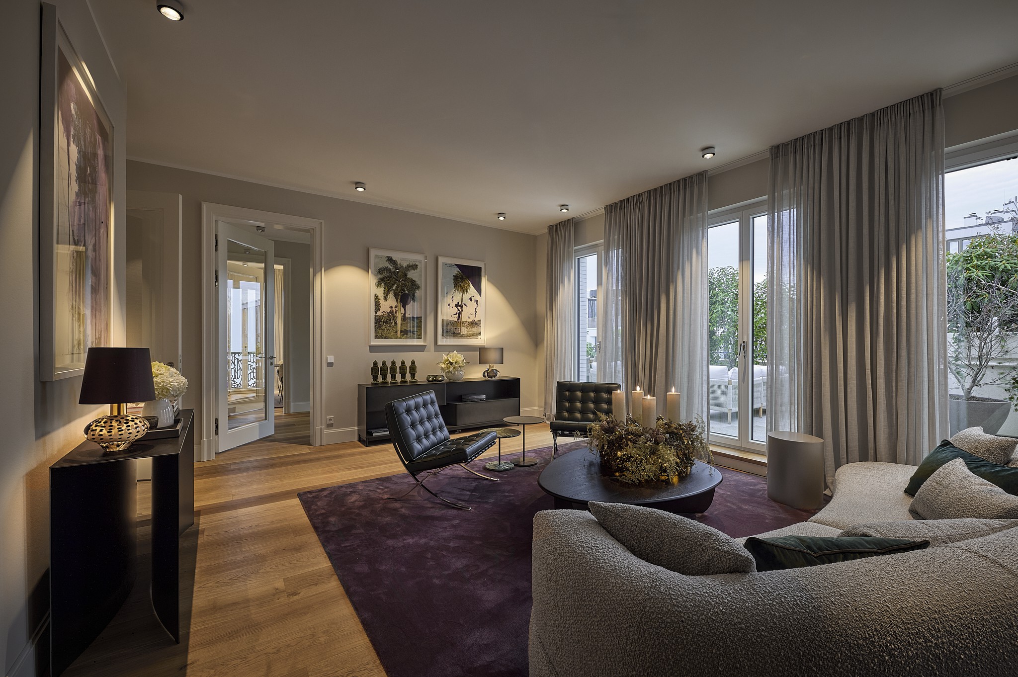 Floor-to-ceiling windows allow plenty of daylight into the rooms and offer unique views of the Sophienterrassen park. Each bedroom naturally has its own bathroom and dressing area. There are also discreetly and sensibly planned utility rooms and a separate guest WC. The penthouse apartment is characterised by its very individual character in terms of orientation, room layout and space.