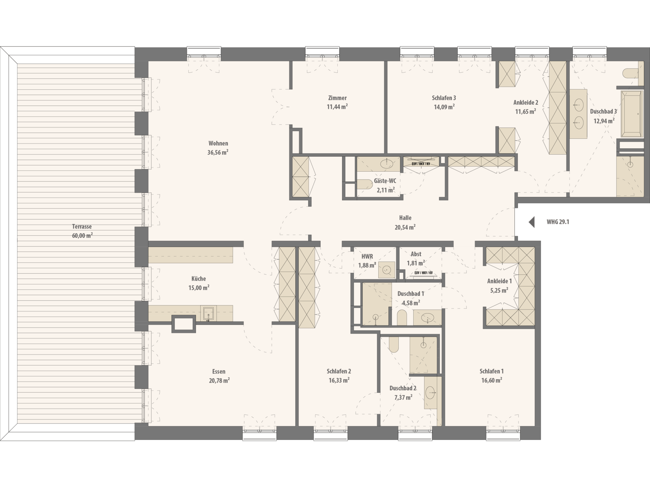 All information, illustrations and calculations have been compiled with the utmost care. Nevertheless, no guarantee can be given for their completeness and accuracy. The graphical representations correspond to the current planning status. We expressly reserve the right to make individual changes. Only the concluded contracts and their annexes are binding for the type and scope of execution and delivery. The furnishings and room layout shown in the plans and drawings are only a suggestion and are not part of the contract. The three-dimensional visualisations are free artistic representations that do not necessarily reflect the future reality.
