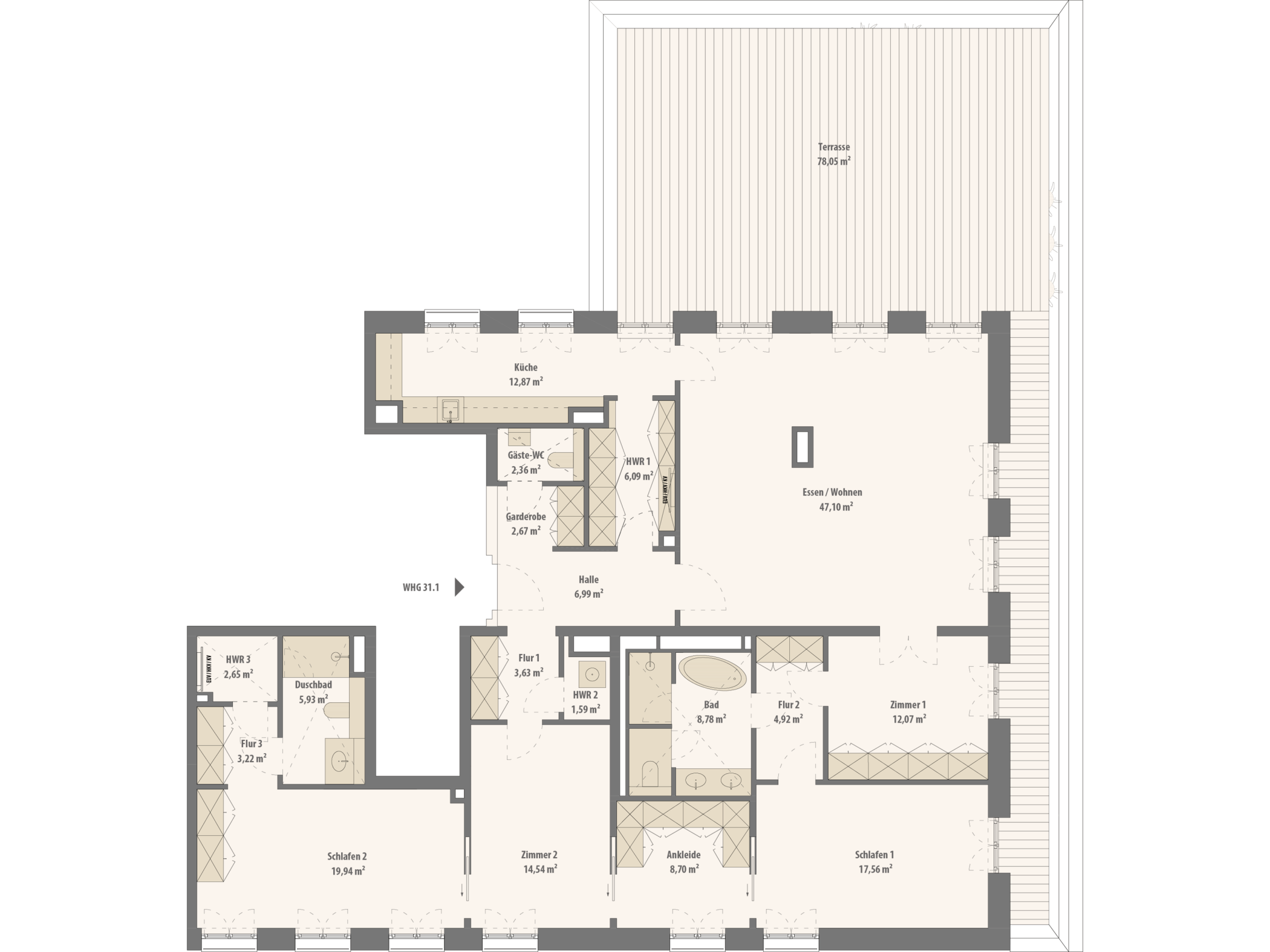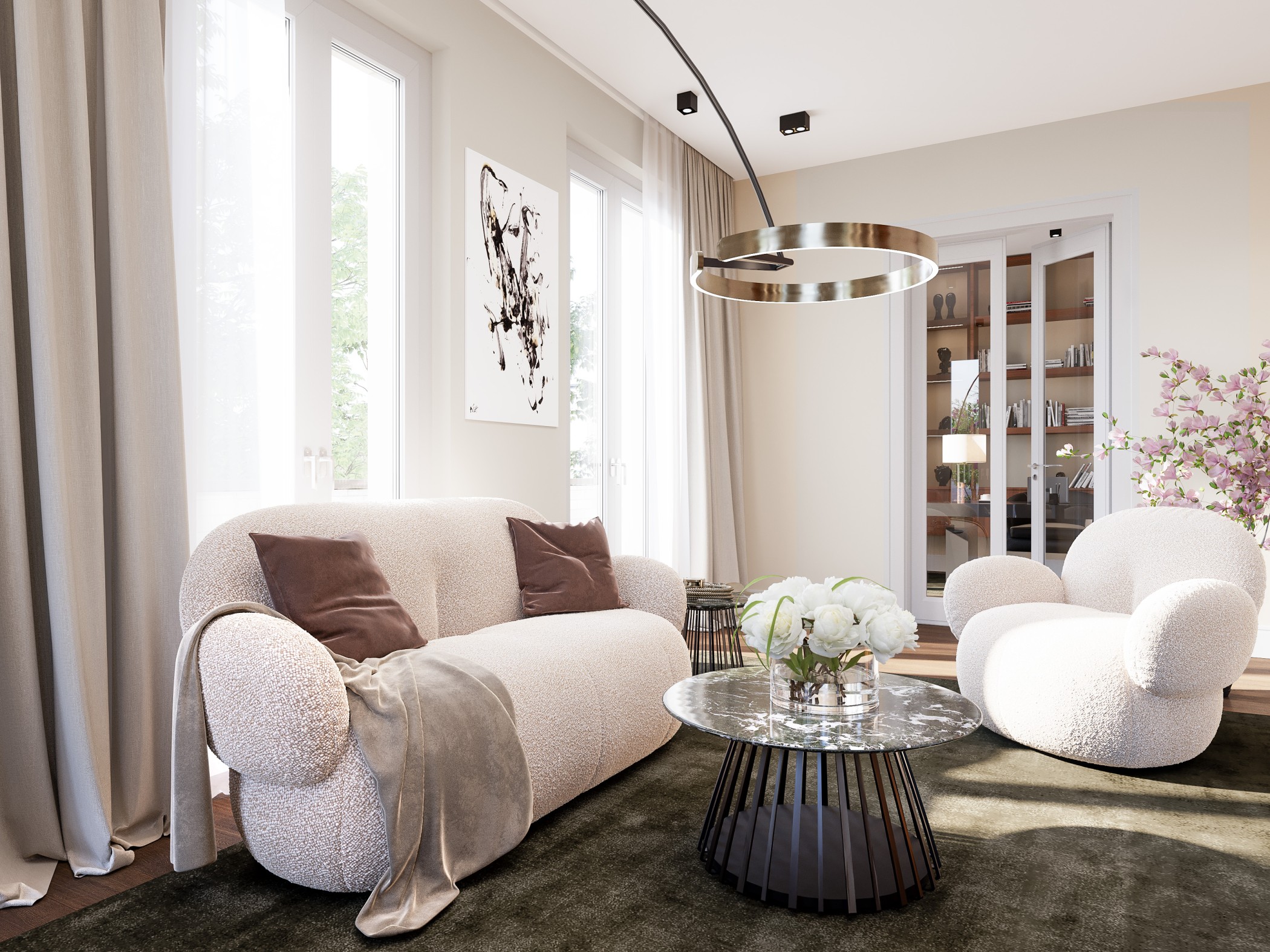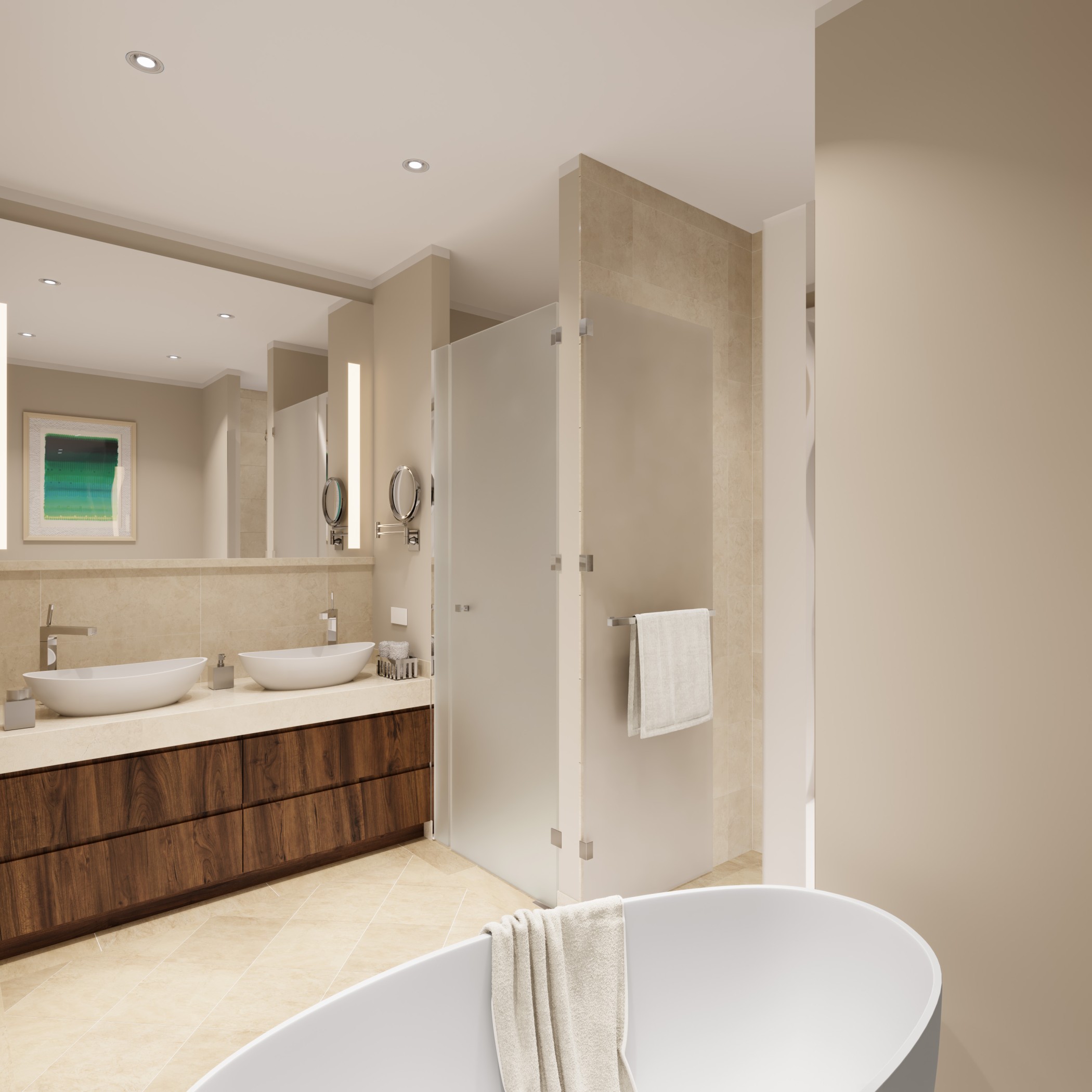 All information, illustrations and calculations have been compiled with the utmost care. Nevertheless, no guarantee can be given for their completeness and accuracy. The graphical representations correspond to the current planning status. We expressly reserve the right to make individual changes. Only the concluded contracts and their annexes are binding for the type and scope of execution and delivery. The furnishings and room layout shown in the plans and drawings are only a suggestion and are not part of the contract. The three-dimensional visualisations are free artistic representations that do not necessarily reflect the future reality.