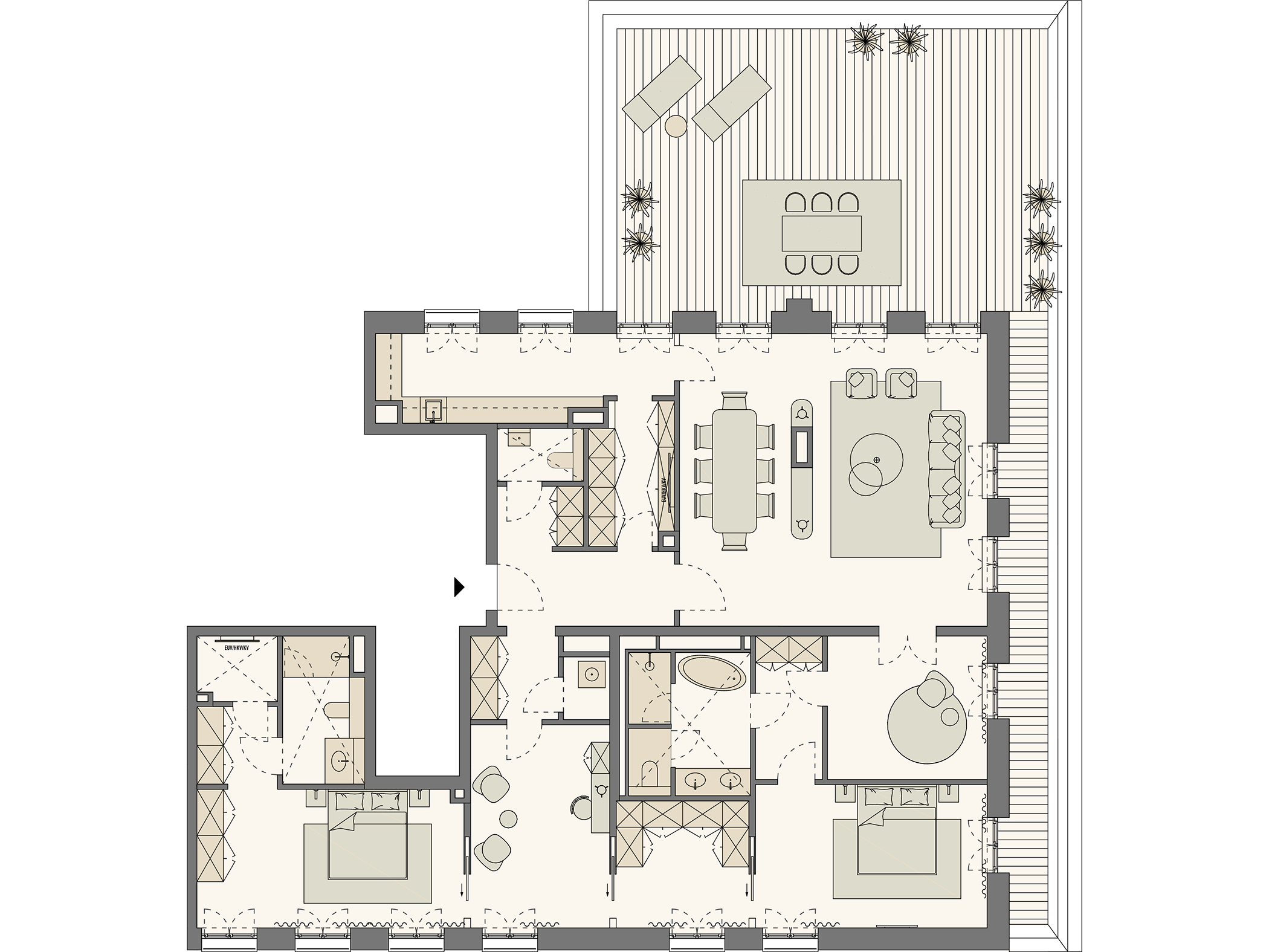 PENTHOUSE N°2 on the 3rd floor of the SOPHIE extends over 228.68 m² and offers two spacious bedrooms. This exclusive flat combines luxurious furnishings with modern comfort. The fine oak floorboards and 17 cm high skirting boards create an elegant living atmosphere. Underfloor heating in all rooms, supplemented by electric heating in the bathrooms, ensures cosy warmth. The room-by-room controlled cooling ceilings ensure a pleasant climate all year round. - Large window fronts and French balconies let in plenty of daylight and offer impressive views. Individually controllable lighting concepts and an integrated sun protection system ensure maximum living comfort and privacy.
