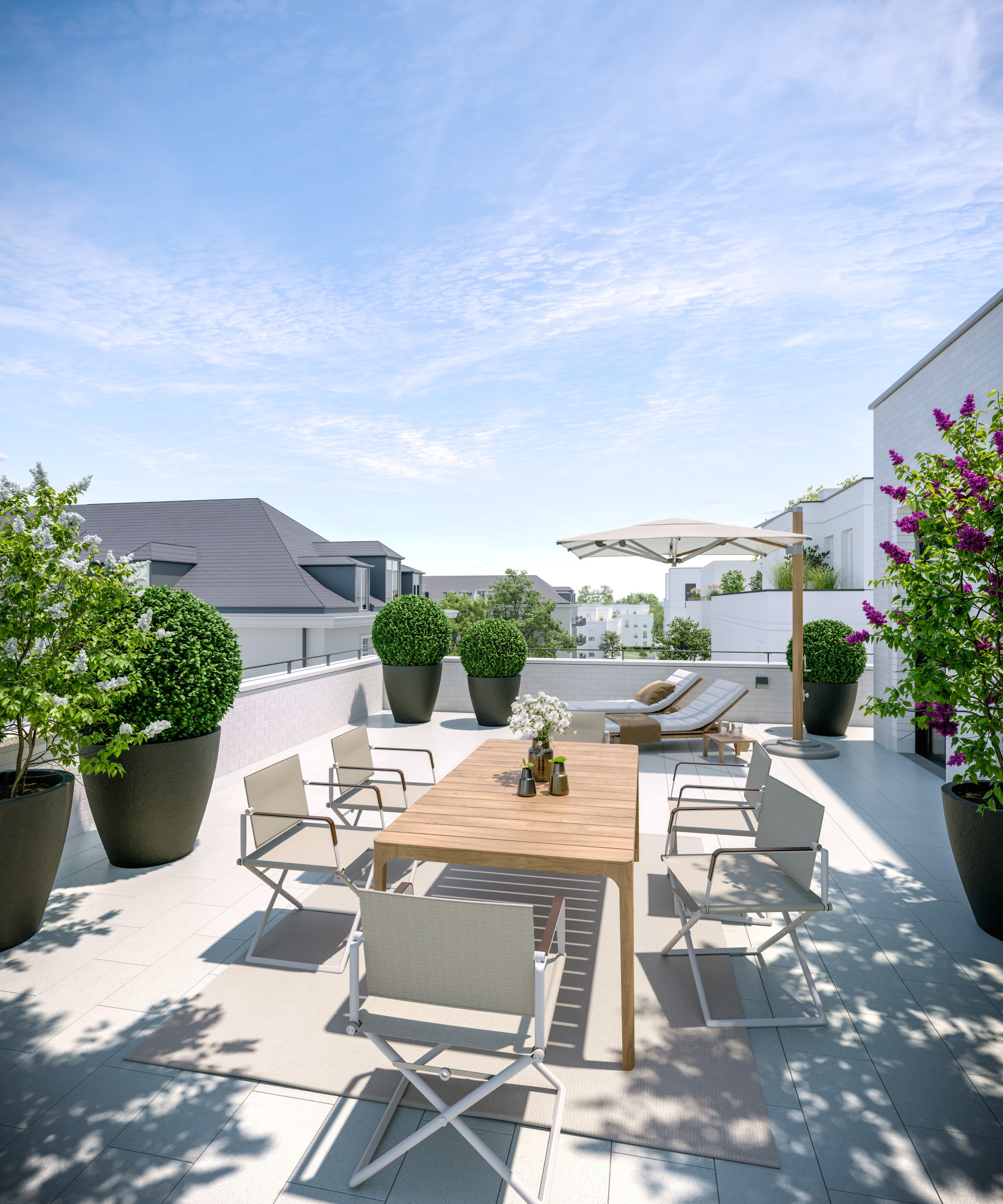 PENTHOUSE N°2 benefits from SOPHIE's prime location in Harvestehude, one of Hamburg's most sought-after neighbourhoods. The proximity to the Outer Alster and the carefully designed outdoor areas offer a perfect balance between urban living and natural recreation. Underground parking spaces, lifts, comprehensive security measures and a doorman service add to the living comfort.